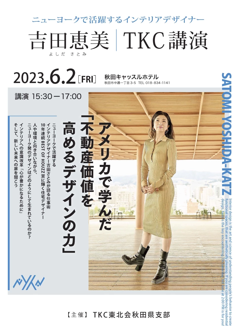 On June 2, 2023, I had the opportunity to present a lecture titled "From Vision to Value: Harnessing Design to Transform Residential Real Estate" at the Akita Castle Hotel for the TKC Tohoku Association. This lecture focused on the vital role that thoughtful residential design plays in enhancing property value, informed by my personal experiences and specific case studies from my portfolio.