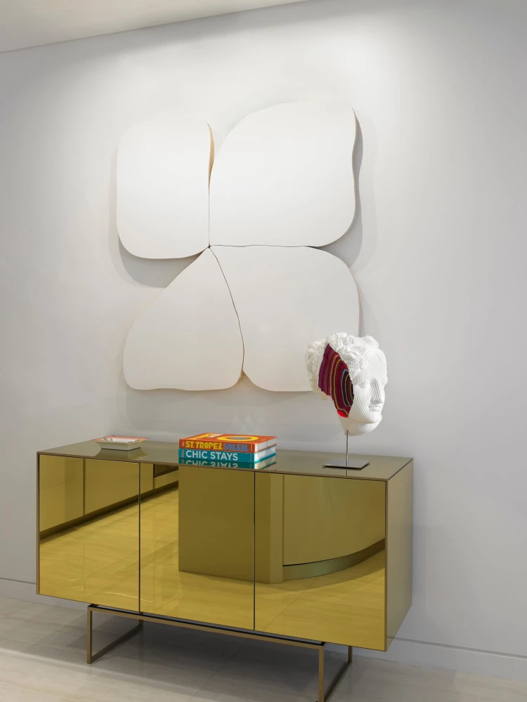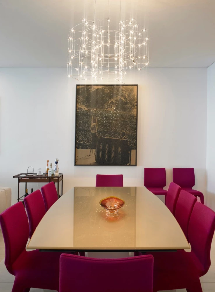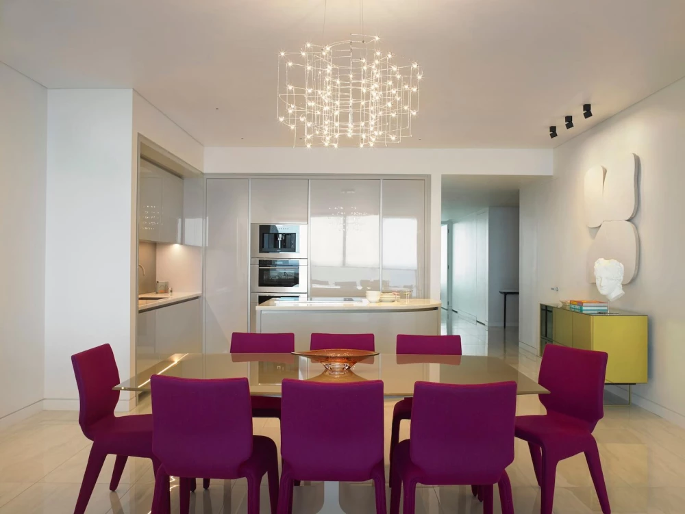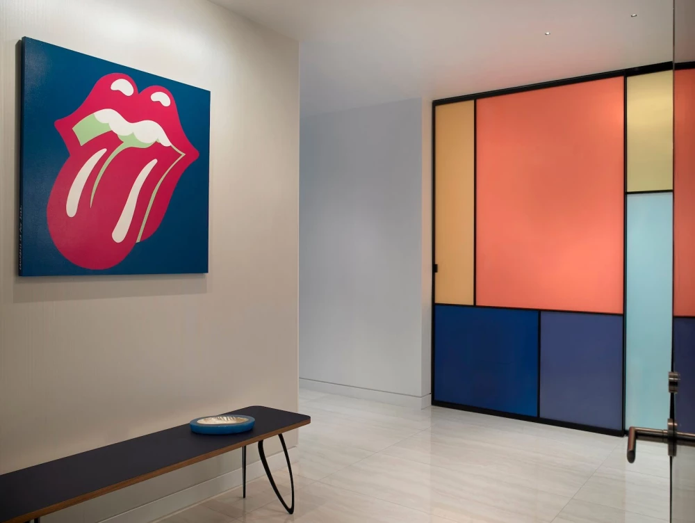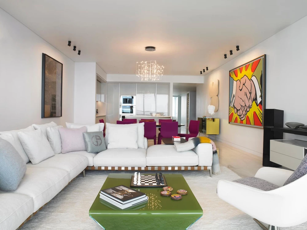 The design integrates smart home technology and a dynamic lighting system to highlight the client’s art collection while maintaining maximum ceiling heights. Key features include a private foyer with a bold, welcoming atmosphere, a serene gallery entry with custom Italian sliding doors, and a dining area that balances vibrant colors with sophisticated furnishings.