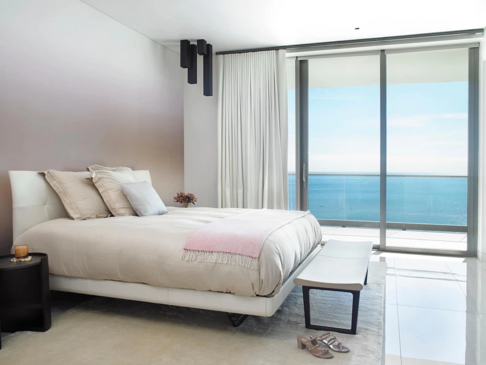This 3,200-square-foot condominium at Armani Casa Residences in Sunny Isles Beach offers expansive ocean and bay views, designed as the perfect second home for a professional family. YZDA created a space that blends luxury with comfort, using natural materials including marble and American walnut, complemented by matcha green accents, to reflect the designer's Japanese-inspired aesthetic.