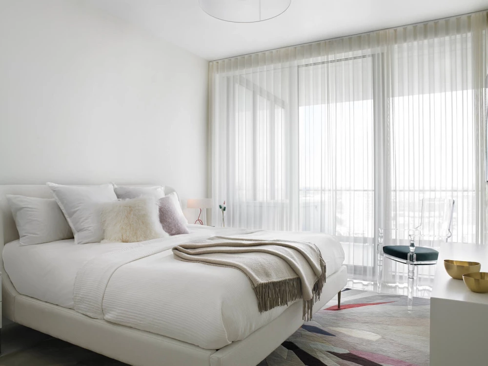 In the primary bedroom, YZDA aimed for a romantic and serene ambiance, complete with a custom blackout shade system for optimal comfort. The boys' bedroom is designed for flexibility, featuring a 2-bunk wall unit that transforms into a sofa and desk, while the guest bedroom exudes an ethereal charm with delicate, sky-blue accents.