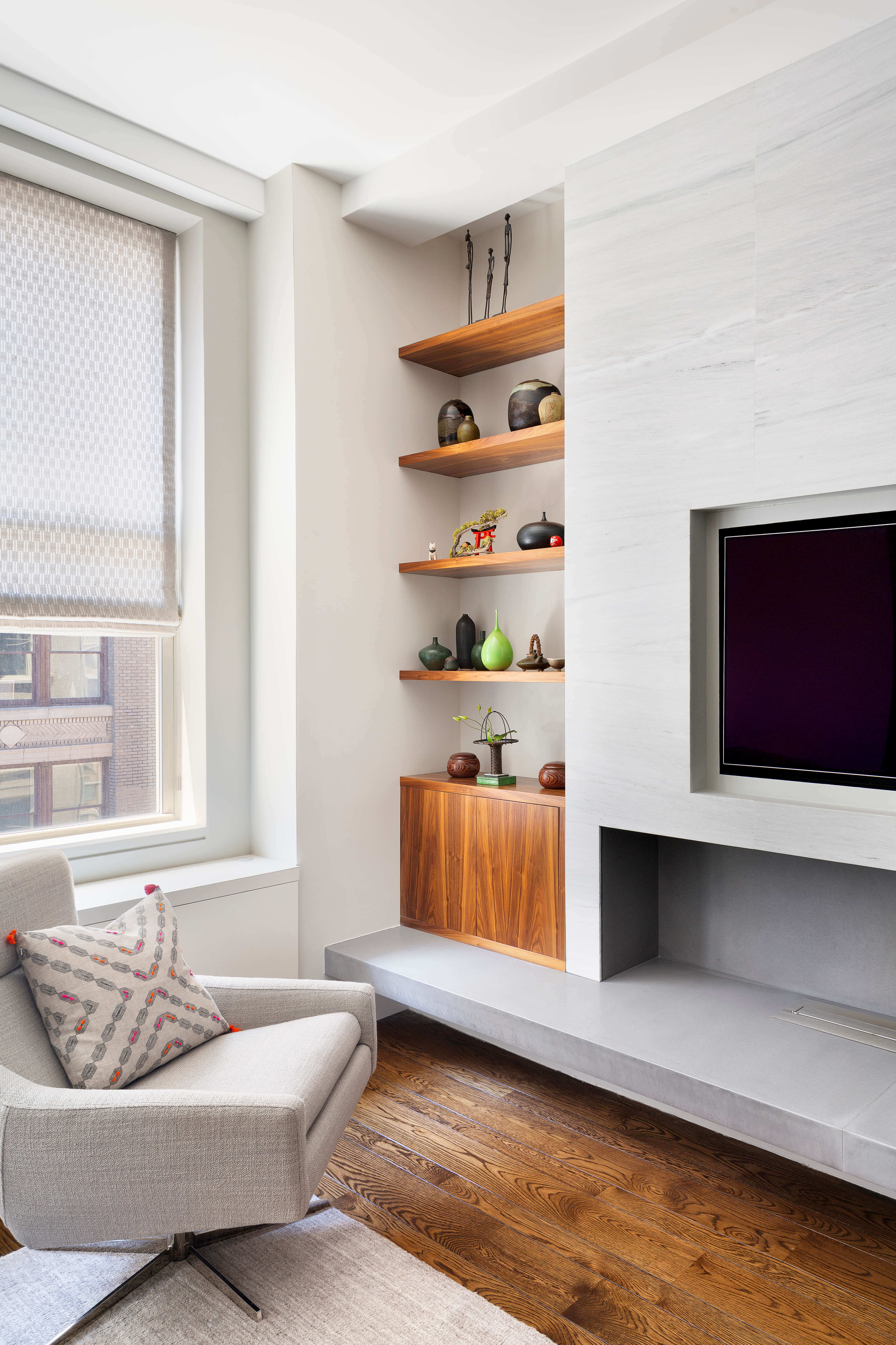 The living room features a balanced, asymmetrical fireplace made of soft white-gray limestone, inspired by Japanese aesthetics. Custom walnut display cases showcase the couple’s collection of handcrafted artifacts, adding warmth and personal meaning to the space. In the kitchen, YZDA used Neolith porcelain slabs for functionality and paired them with Italian cabinets, creating a sleek, organized space for cooking and entertaining.