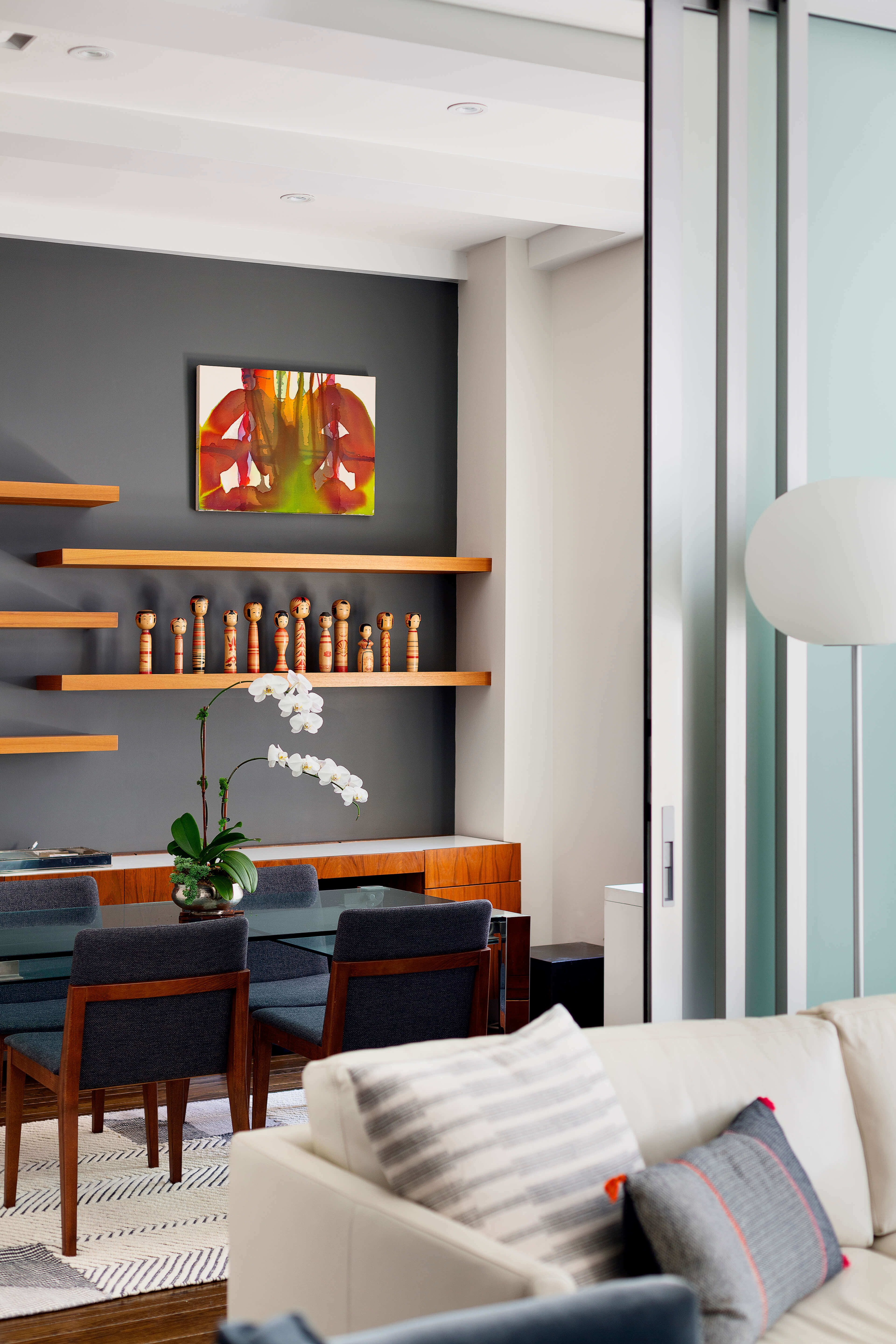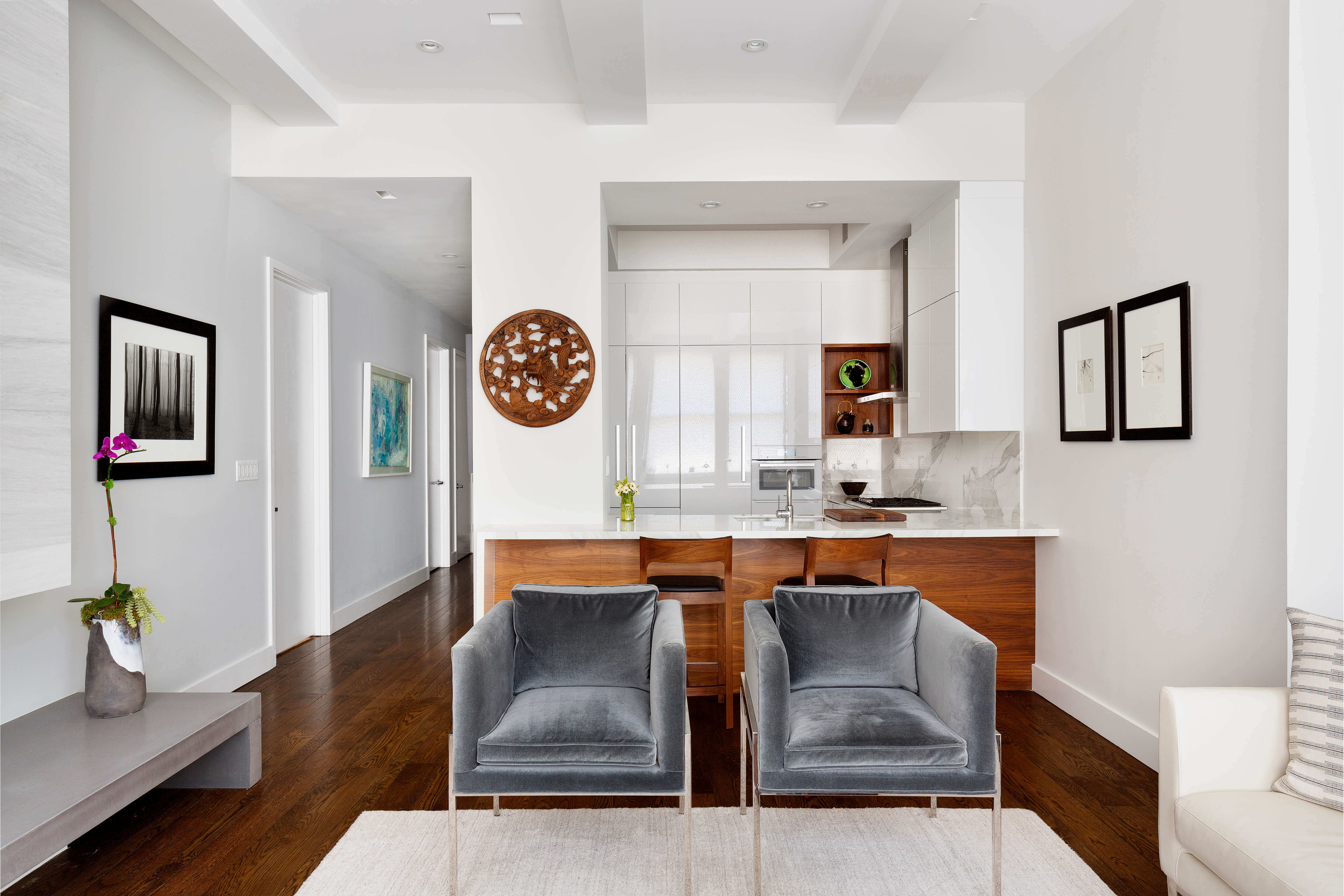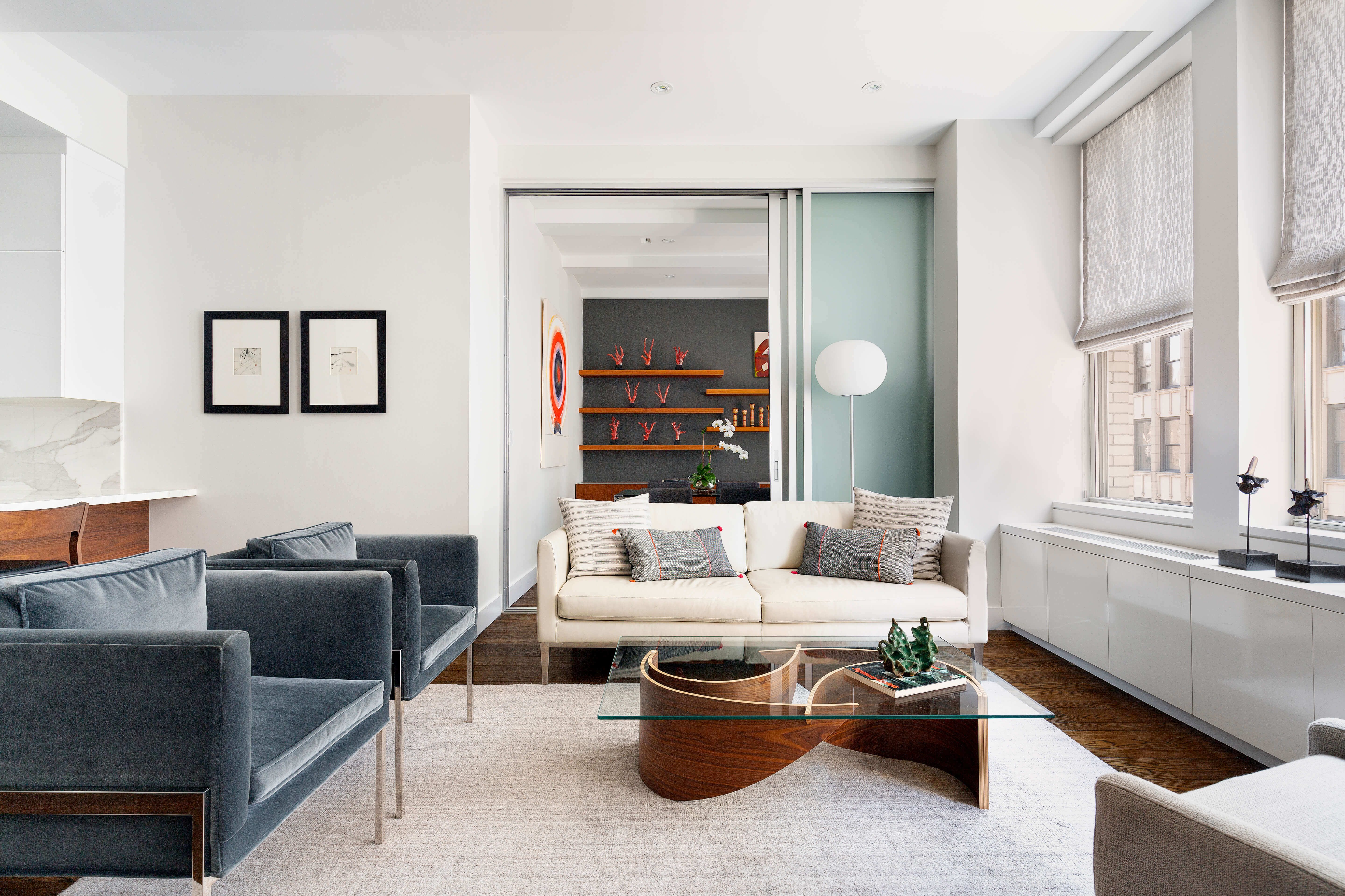 A palette of whites, combined with touches of walnut wood, blue-gray velvet, and a white leather sofa, brings a sense of calm and cohesion throughout the home. Translucent glass sliding doors provide privacy while maintaining an open, airy feel. The result is a bright, welcoming home that blends modern design with quiet luxury, offering a peaceful sanctuary in the heart of New York City.