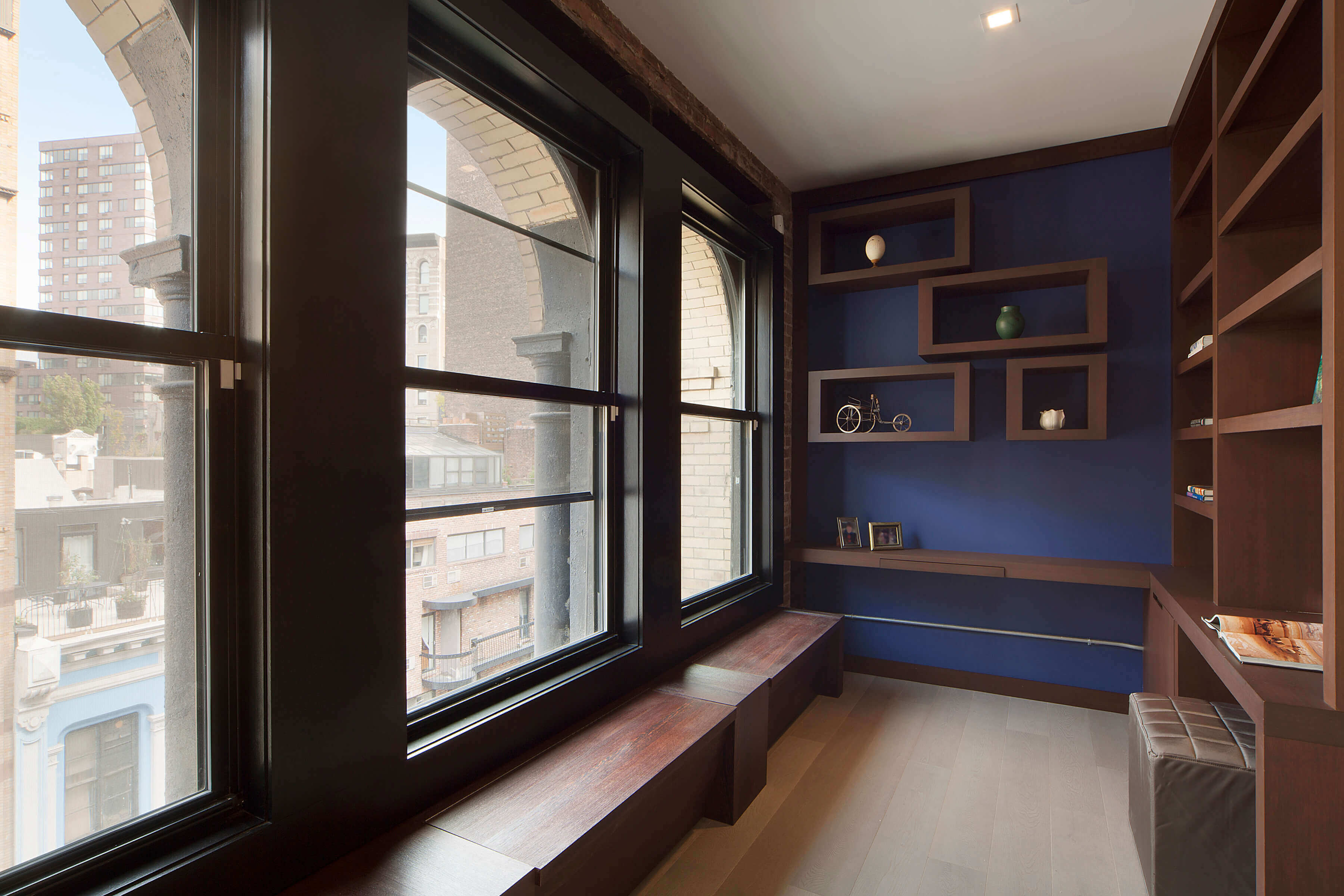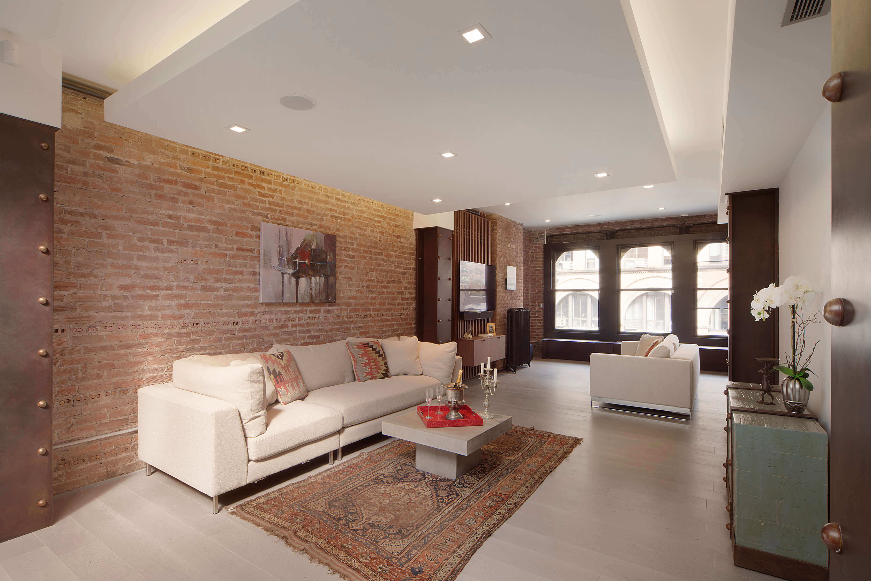 The open-loft layout is enhanced by a lean and uncluttered TV/media area, allowing the expansive space to feel both open and intimate. The retention of classic radiators and the addition of a custom walnut wall introduce warmth and texture, softening the industrial backdrop and creating a cozy, inviting atmosphere. These elements work together to provide a sense of comfort and refinement, inviting residents to feel both relaxed and inspired.