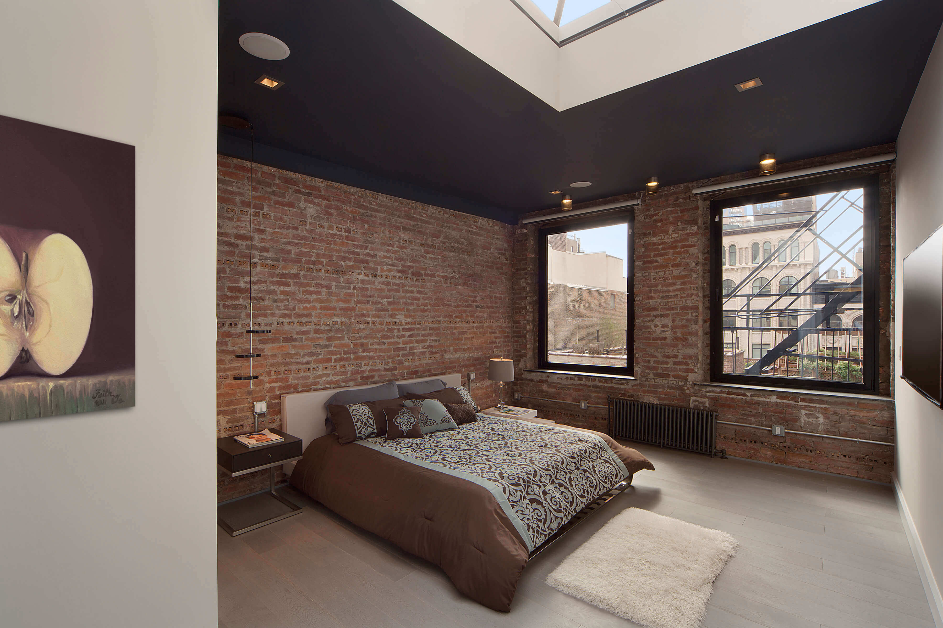The design also pays homage to the vibrant spirit of New York City. Graffiti-inspired tiles in the bathroom add a playful, urban edge, while the deep-grey ceiling in the master bedroom accentuates the natural light streaming in from the skylight. This creates a dramatic yet soothing environment that captures the essence of city living—bold, diverse, and full of character. The result is a space that feels distinctly personalized, where every design choice contributes to a cohesive narrative of style, comfort, and cosmopolitan charm.