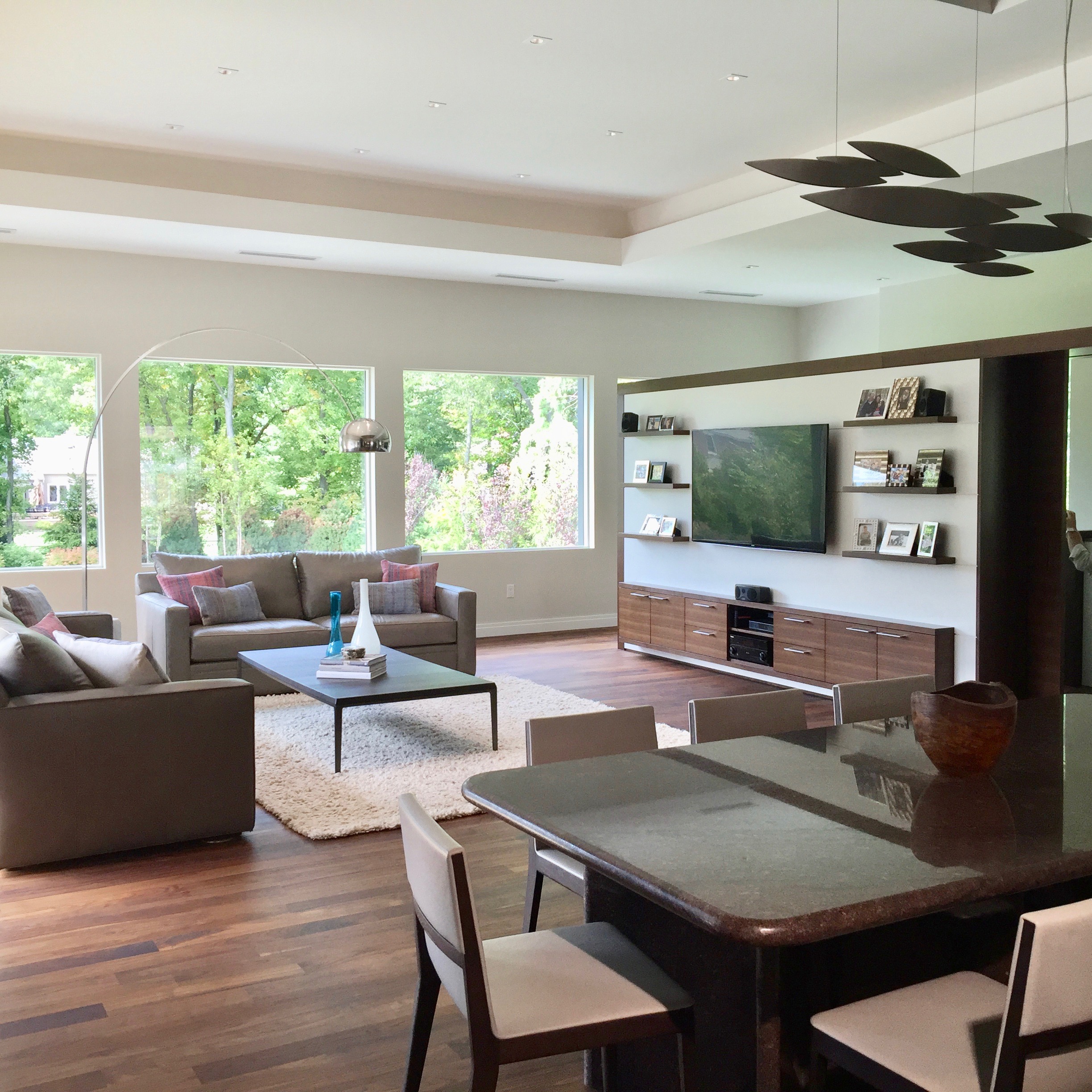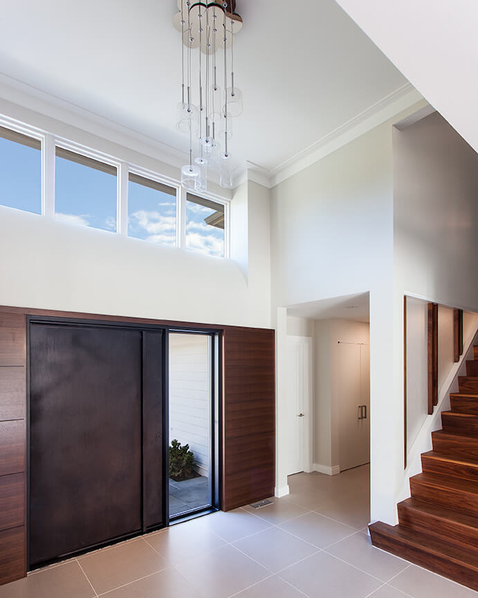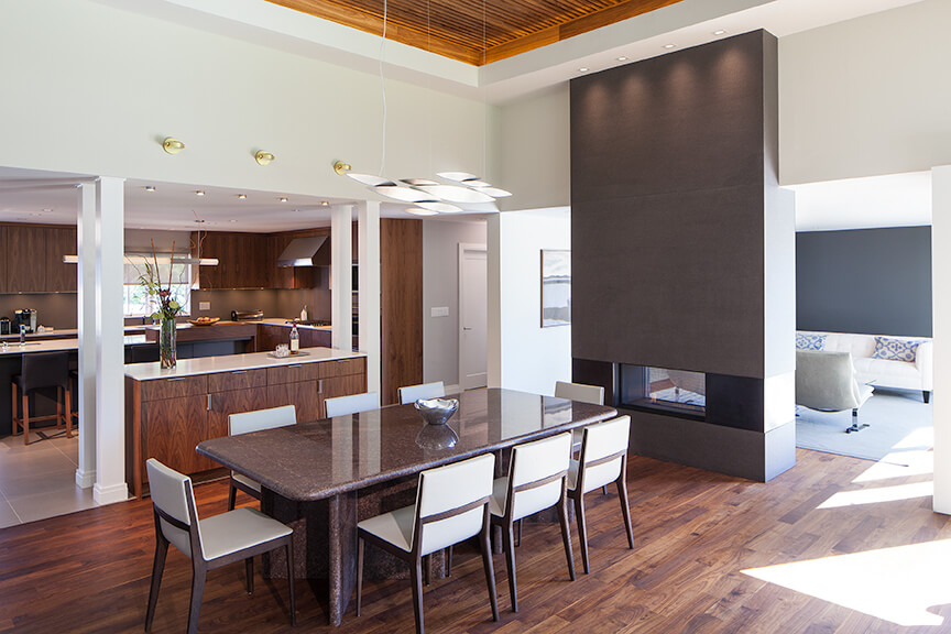 A comprehensive color consultation tied together the architectural elements, ensuring harmony throughout the design while mirroring the homeowners’ lifestyle centered around well-being and connection. Italian handcrafted furniture, dramatic high ceilings, and a sleek modern fireplace add to the casual luxe aesthetic, creating a dynamic yet comfortable environment.