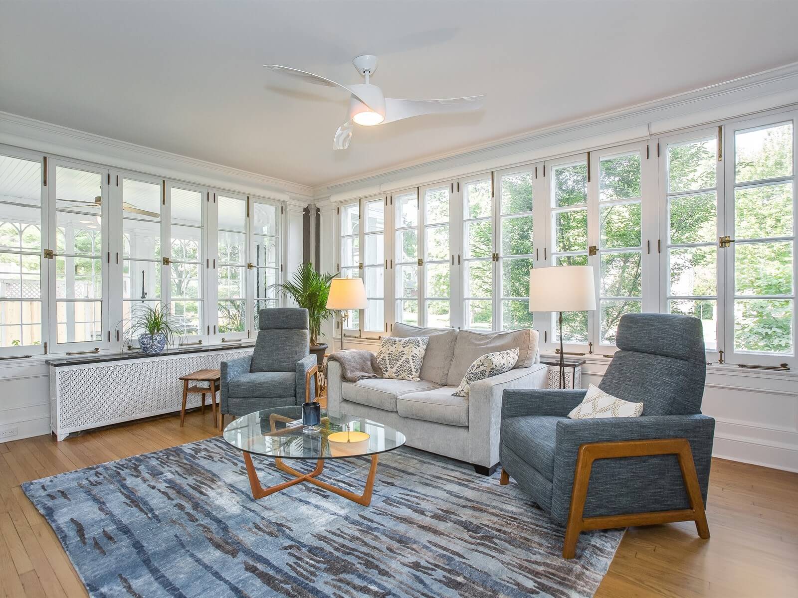 Textures play a vital role in the design, incorporating reclaimed wood, organic fabrics, and stone elements to enrich the environment and enhance well-being. The sunroom, bathed in natural light, has been transformed into a serene retreat for reading, reflection, and entertaining. Cozy seating encourages conversation and relaxation, while thoughtfully placed greenery deepens the connection to the landscape, mirroring the rhythms of the seasons.