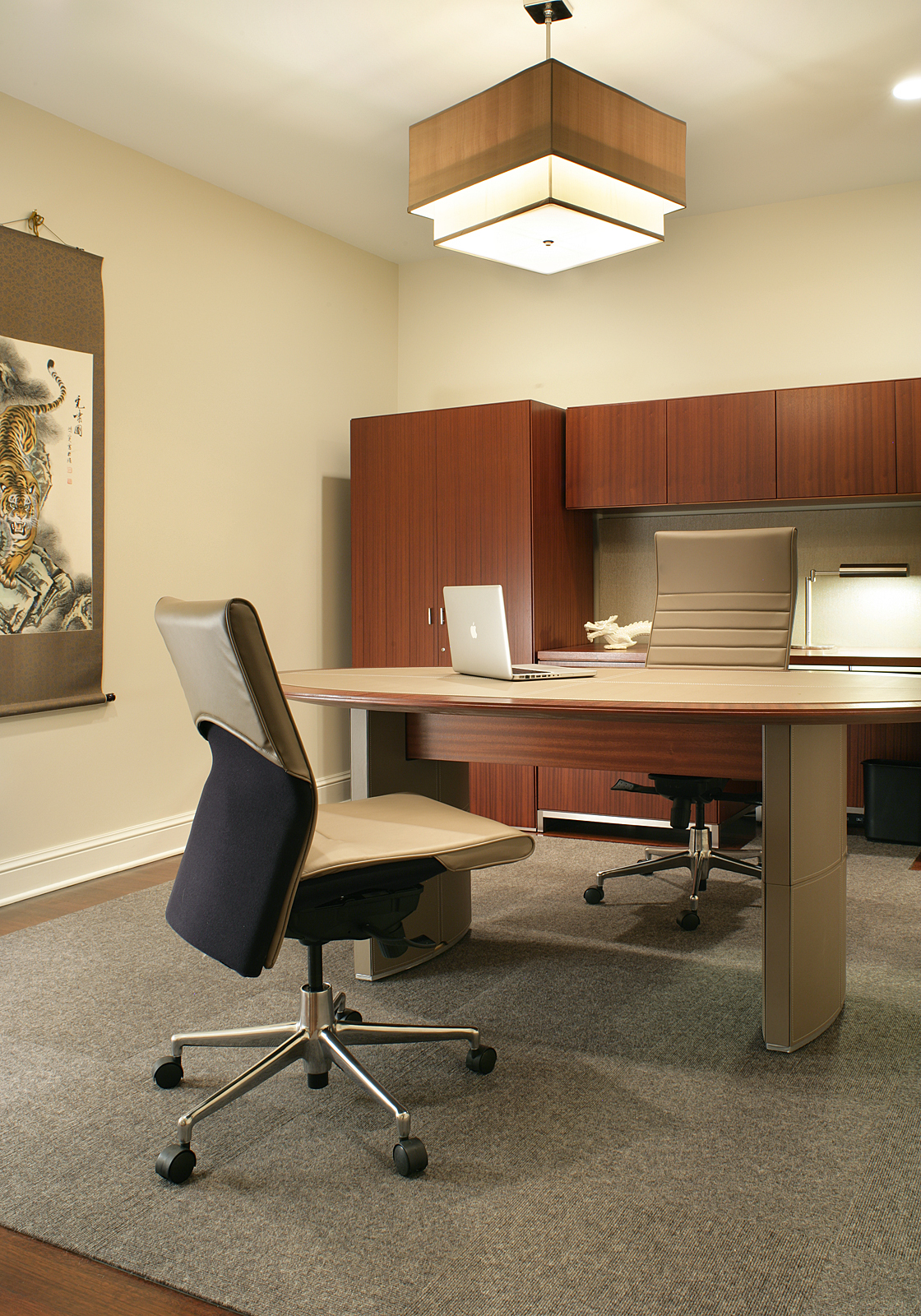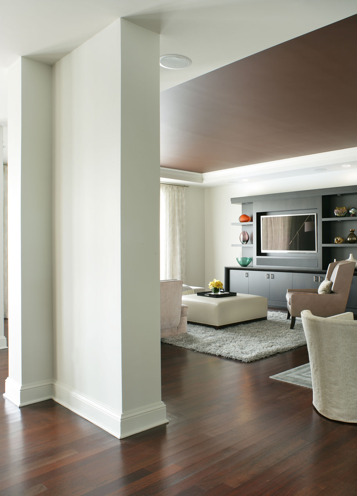 The color palette features soft neutral tones that evoke calm and balance, contrasted by rich dark wood flooring and furnishings that ground the space with a sense of depth and warmth. White leathers, patterned wall coverings, and sheer draperies add layers of texture, inviting the eye to explore and appreciate the subtle details. This thoughtful combination of materials creates a harmonious environment that feels timeless and inviting, where every element complements the other in a dance of textures and tones.