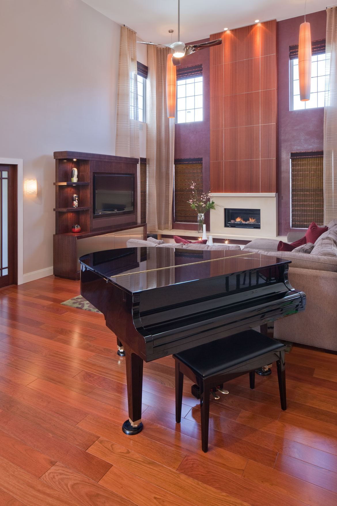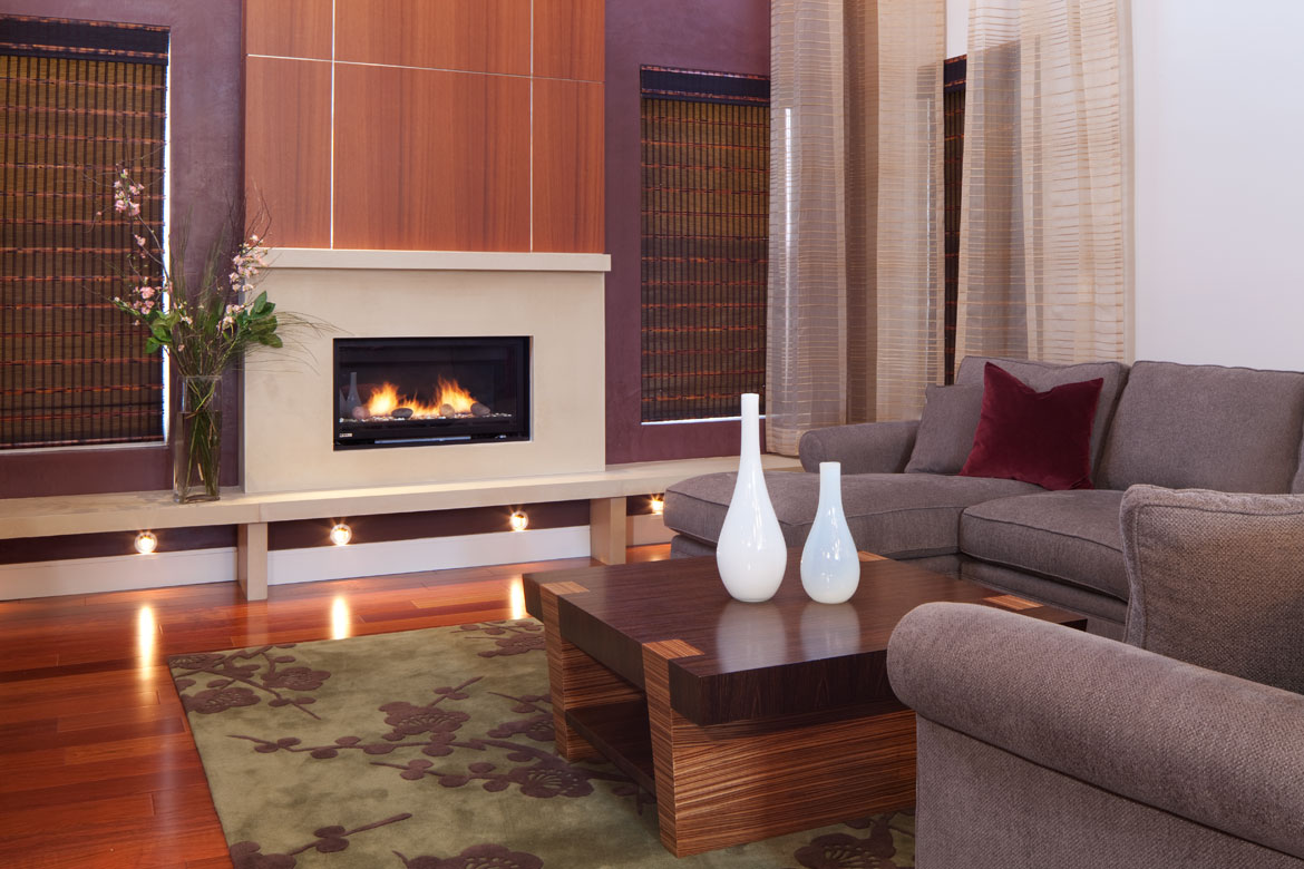 A commitment to green design was woven throughout the project, with sustainable woods and a custom-designed staircase featuring natural grasses embedded in recycled acrylic resin panels. This focus on sustainability not only reflects the beauty of the natural world but also reinforces a sense of mindful living. An ambient, modern fireplace paired with an intimate seating arrangement tempers the expansiveness of the great room, creating cozy corners that invite relaxation and conversation. Oversized sofa cushions, unique lighting, and soft, subtle hues combine to produce a space that is both stylish and nurturing. Custom pleated sheer draperies, designed to mimic the cascading effect of a waterfall, add a final touch of elegance, completing this tranquil environment where every detail whispers calm and comfort.