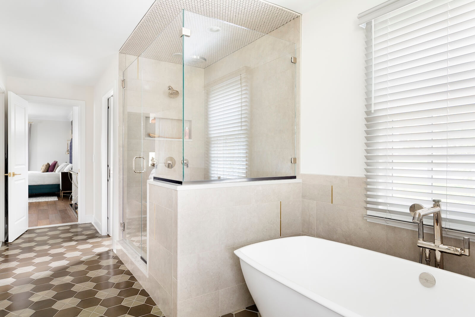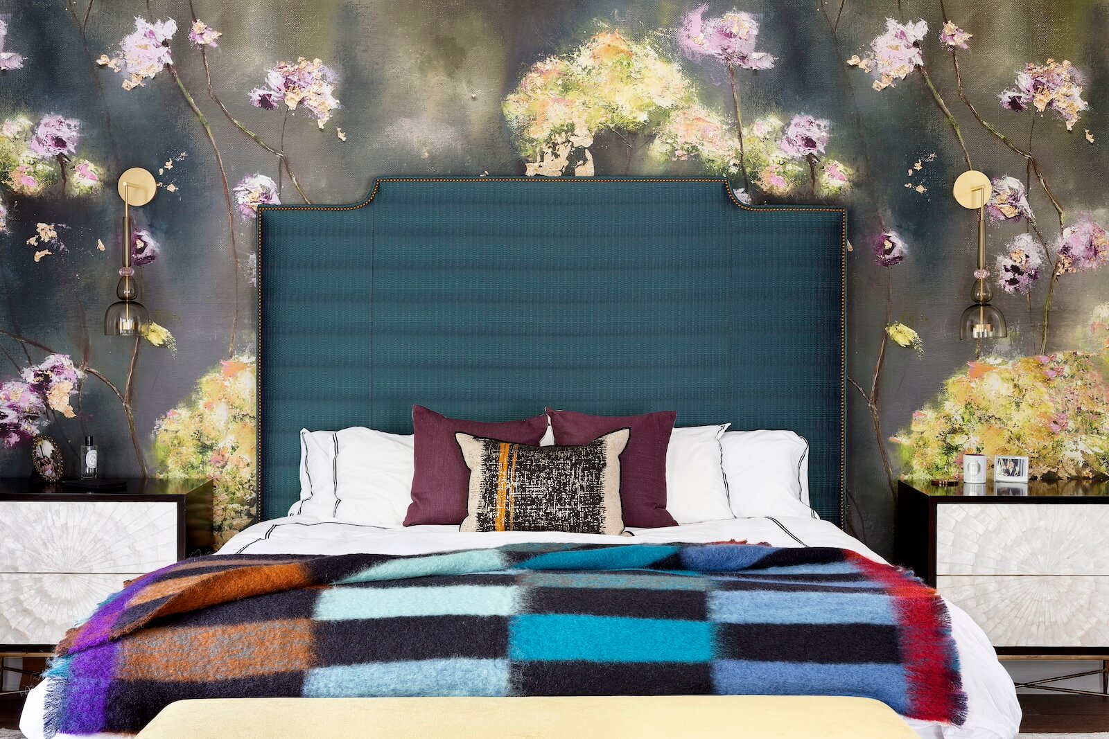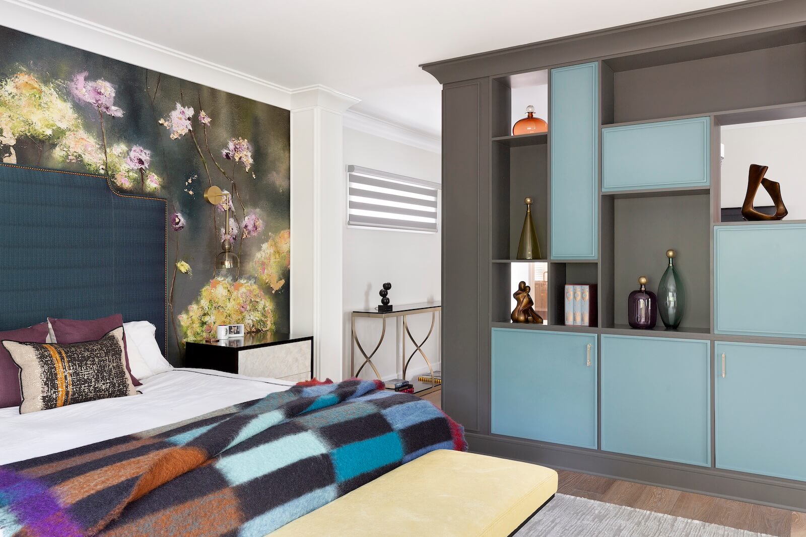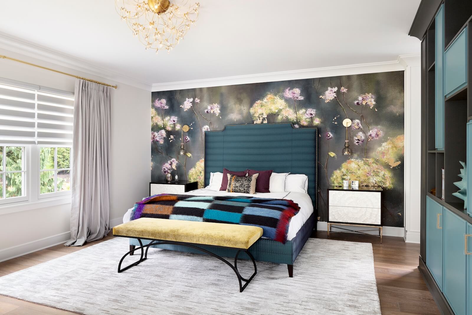 The Primary Suite offers a serene sanctuary, complete with two separate sitting areas and a custom-designed walk-in closet. A large-scale botanical mural introduces a touch of nature, with vibrant pops of color that enhance the tranquil ambiance. Grand cabinetry was integrated to create a private sitting room adjacent to the bedroom, adding both comfort and intimacy.