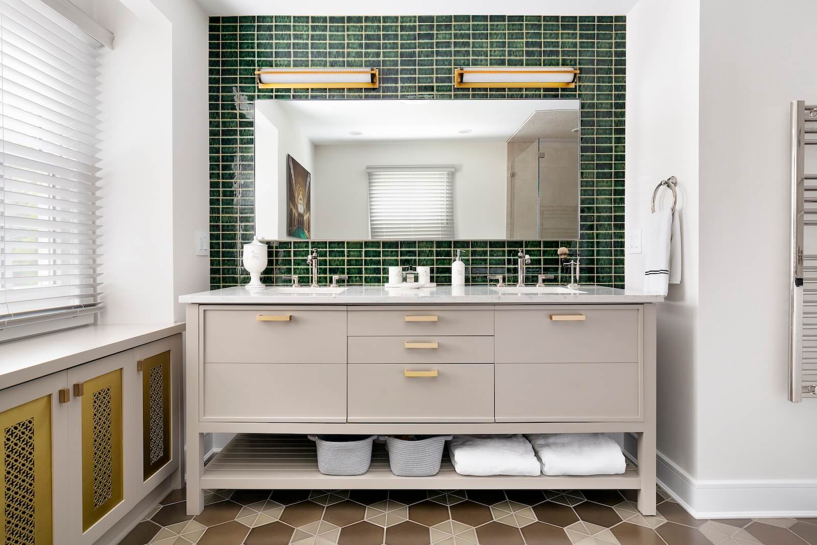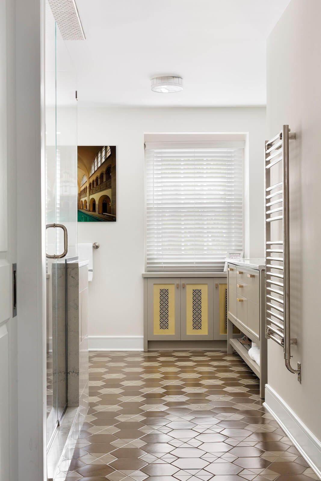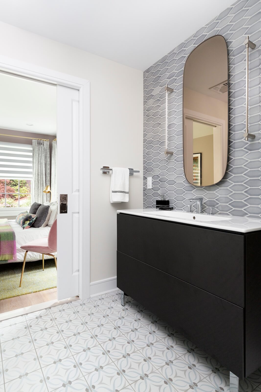 The Primary Suite offers a serene sanctuary, complete with two separate sitting areas and a custom-designed walk-in closet. A large-scale botanical mural introduces a touch of nature, with vibrant pops of color that enhance the tranquil ambiance. Grand cabinetry was integrated to create a private sitting room adjacent to the bedroom, adding both comfort and intimacy.