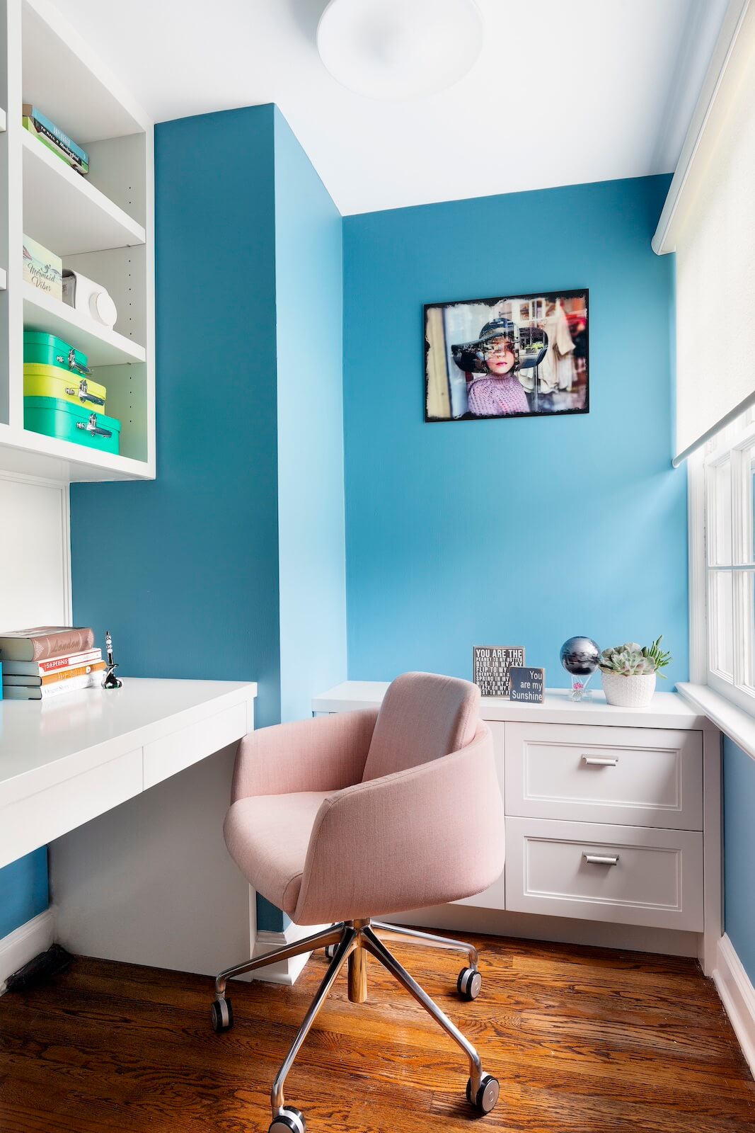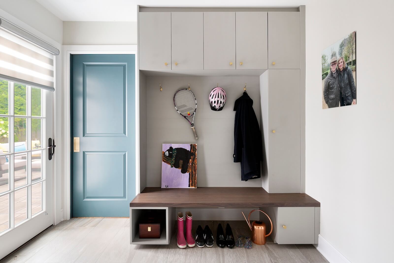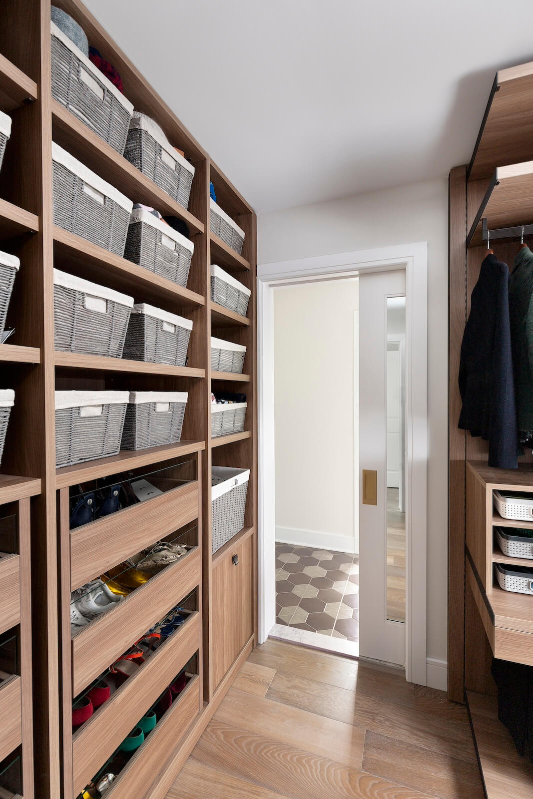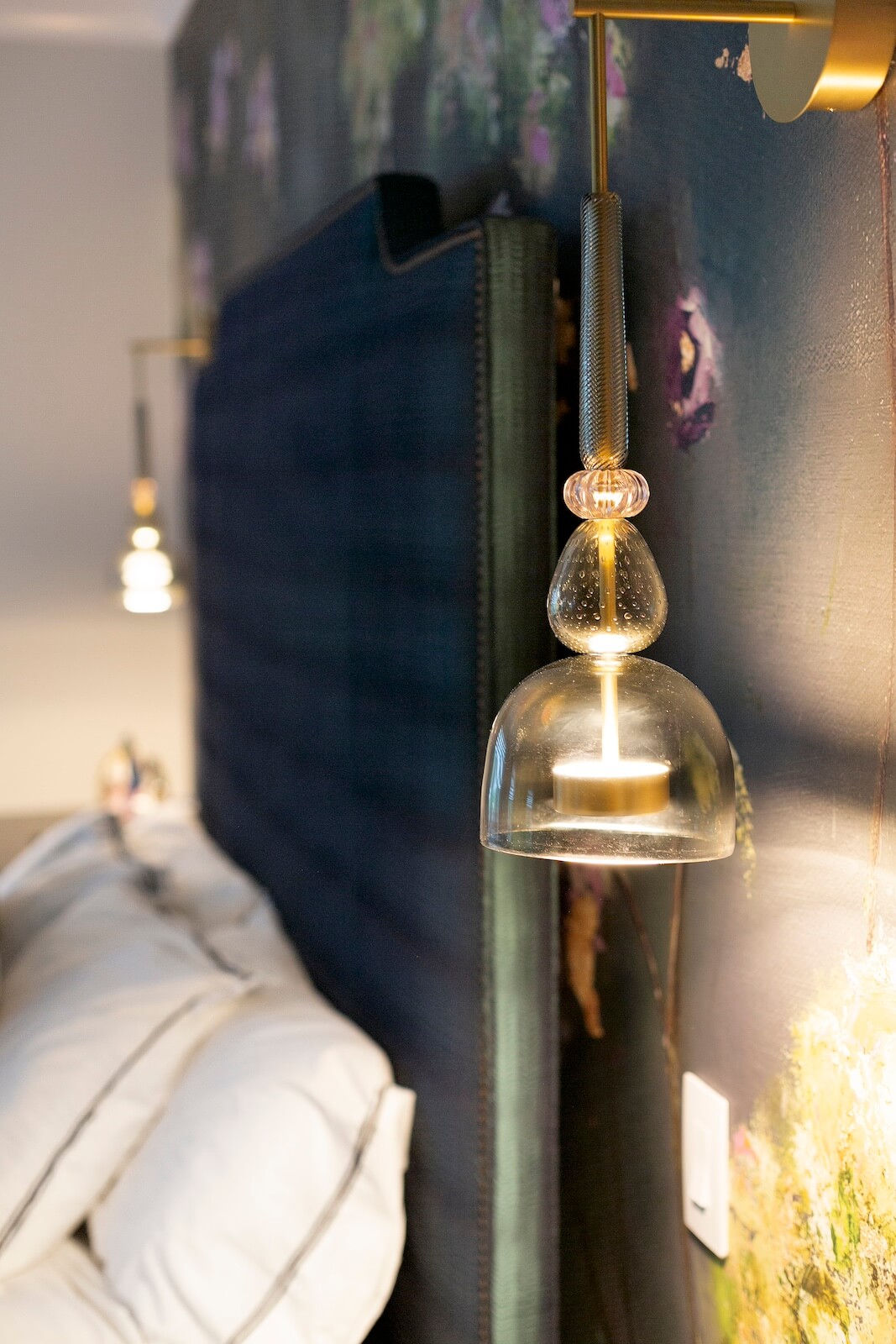 The Primary Suite offers a serene sanctuary, complete with two separate sitting areas and a custom-designed walk-in closet. A large-scale botanical mural introduces a touch of nature, with vibrant pops of color that enhance the tranquil ambiance. Grand cabinetry was integrated to create a private sitting room adjacent to the bedroom, adding both comfort and intimacy.