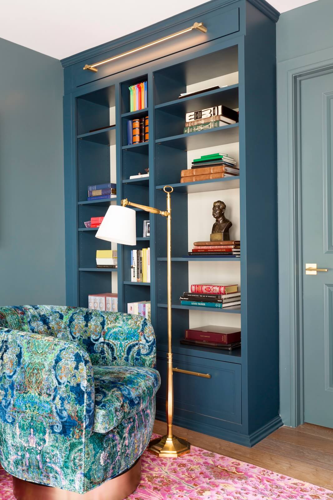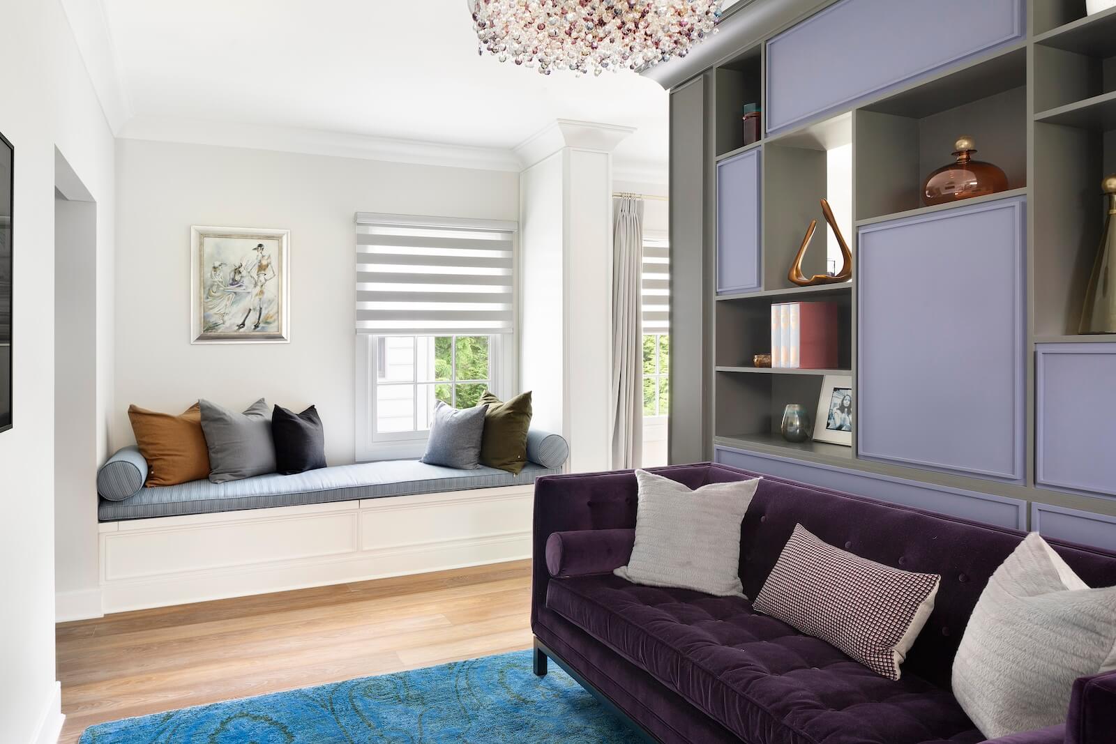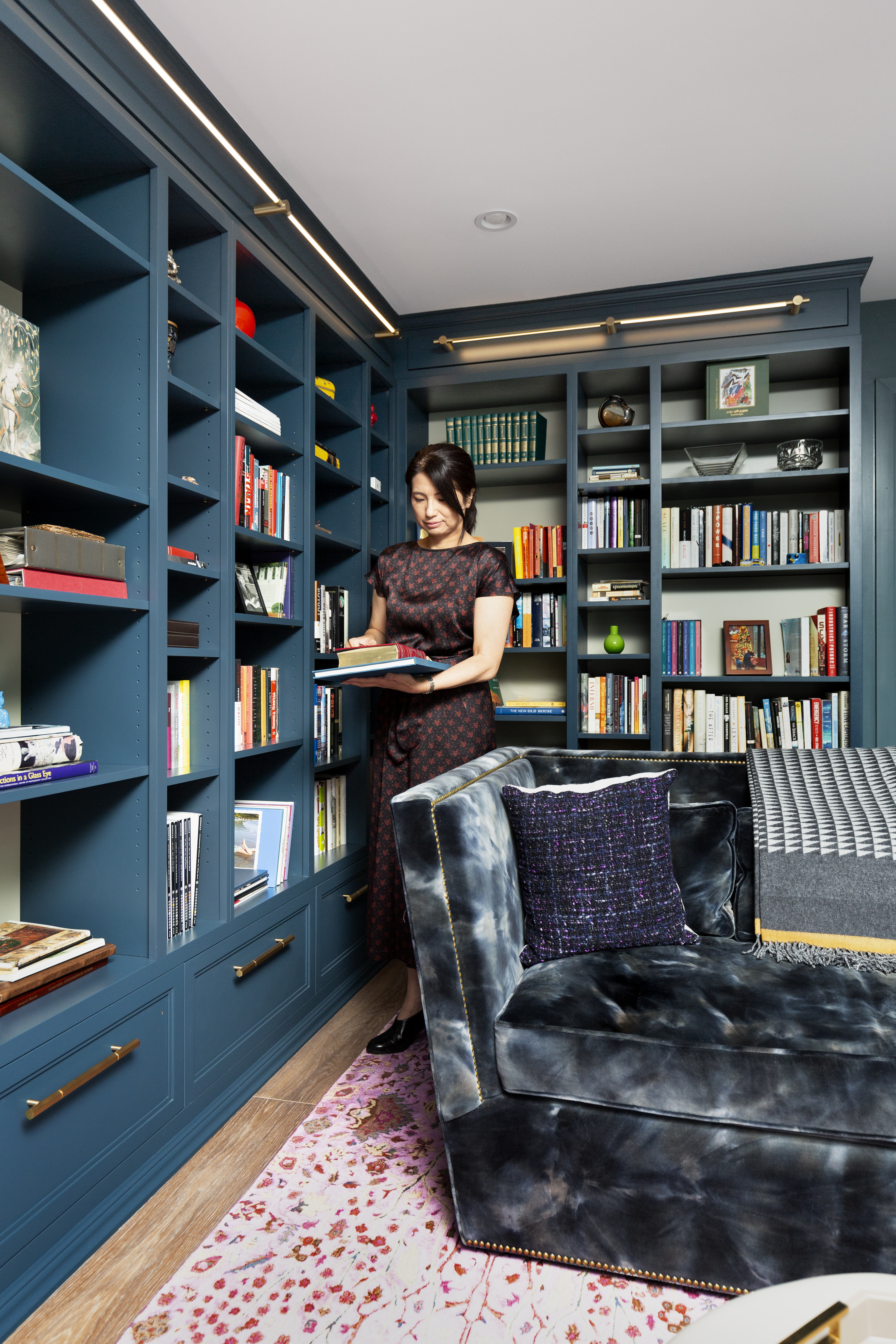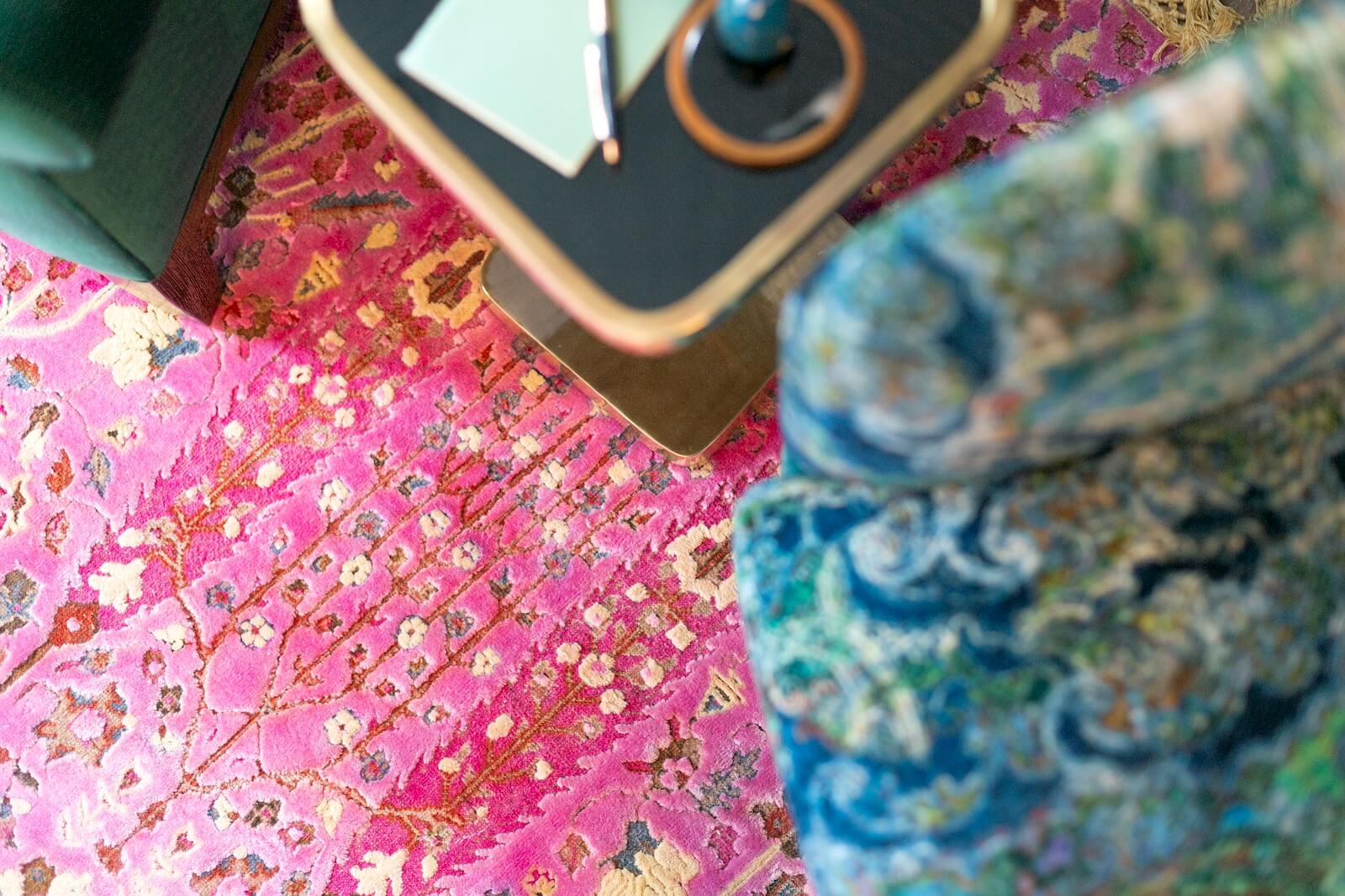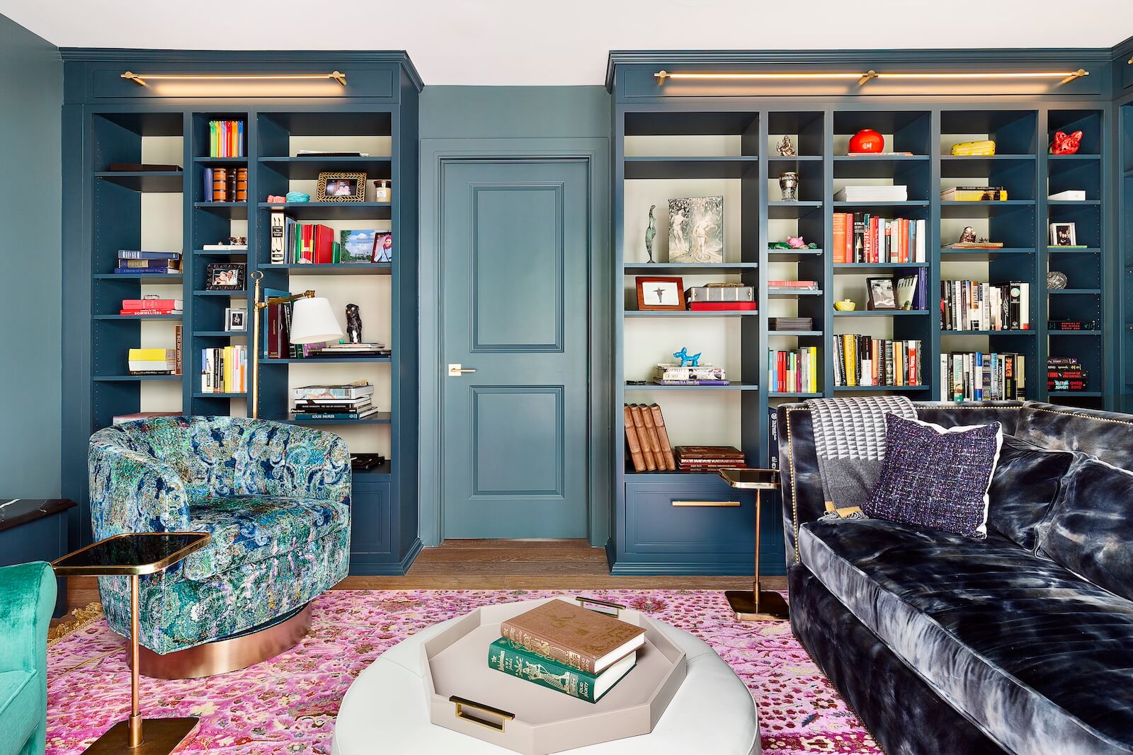The Library Room features custom case goods that provide both functionality and style. A paisley swivel chair and a tie-dyed velvet loveseat rest atop a custom hand-knotted rug crafted from fine silk and merino wool in pink and gold tones. These vibrant elements infuse the space with personality and elegance, making it a unique retreat for the family.