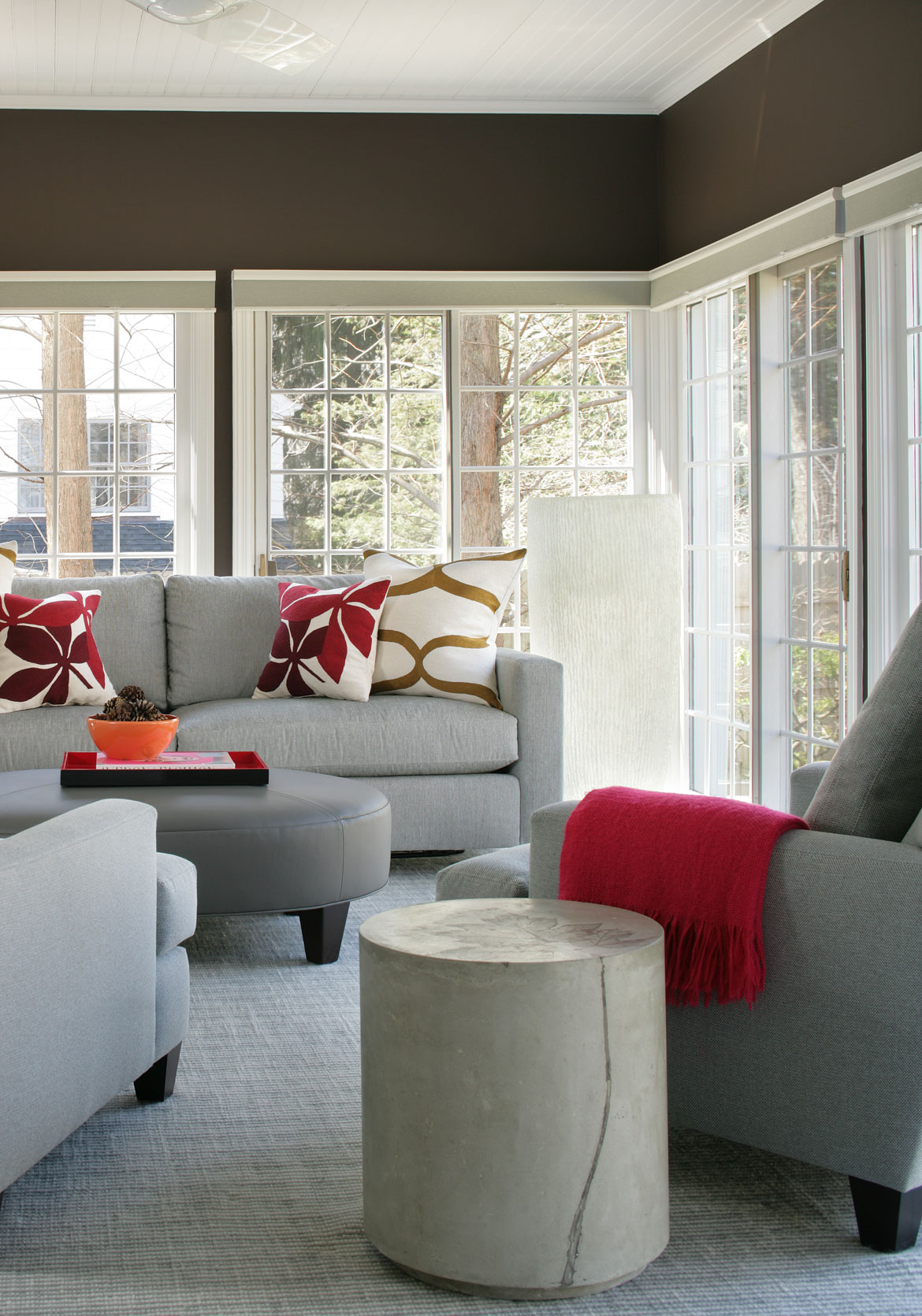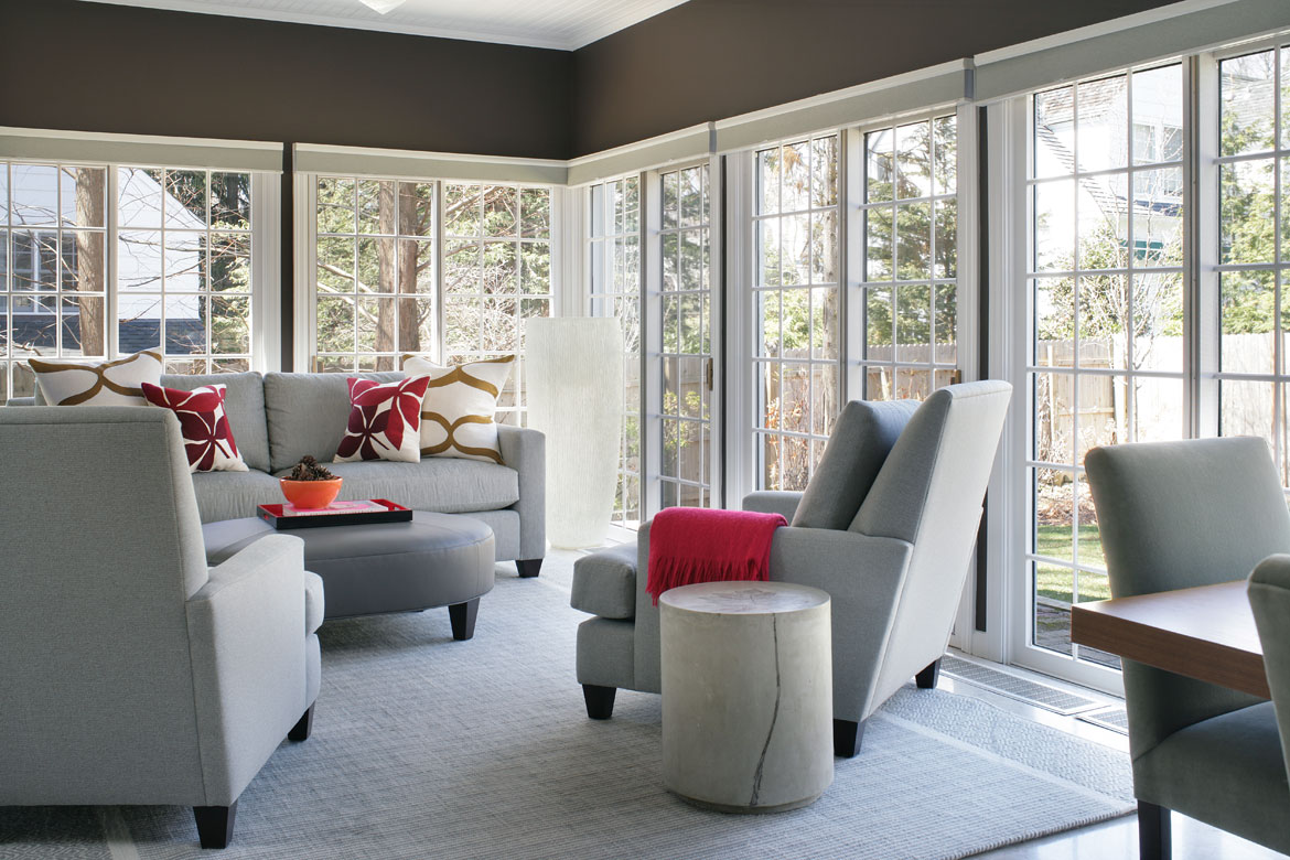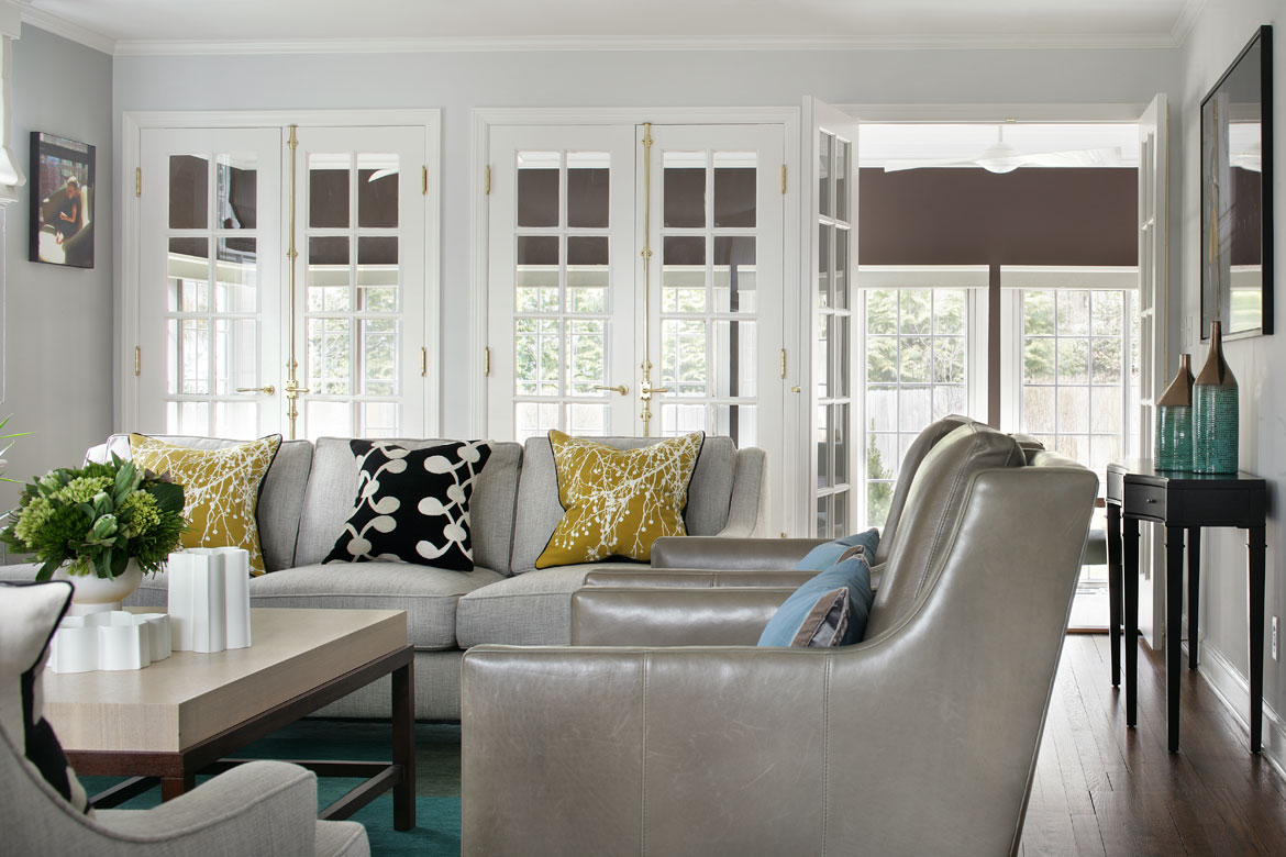 The goal was to craft spaces that cater to both the playful energy of children and the couple's need for sophisticated relaxation and entertaining. Large sunroom windows overlooking the backyard flood the home with natural light, infusing it with a soft glow that enhances the feeling of openness and connection to nature. The gentle palette of fabrics, complemented by restrained splashes of color, anchors the space, making it feel serene and welcoming—a perfect blend of elegance and comfort, where family memories can be created and cherished.